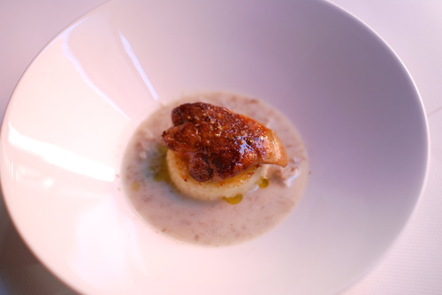 フォアグラと焼きリゾット 芹と牛蒡のブイヨンで